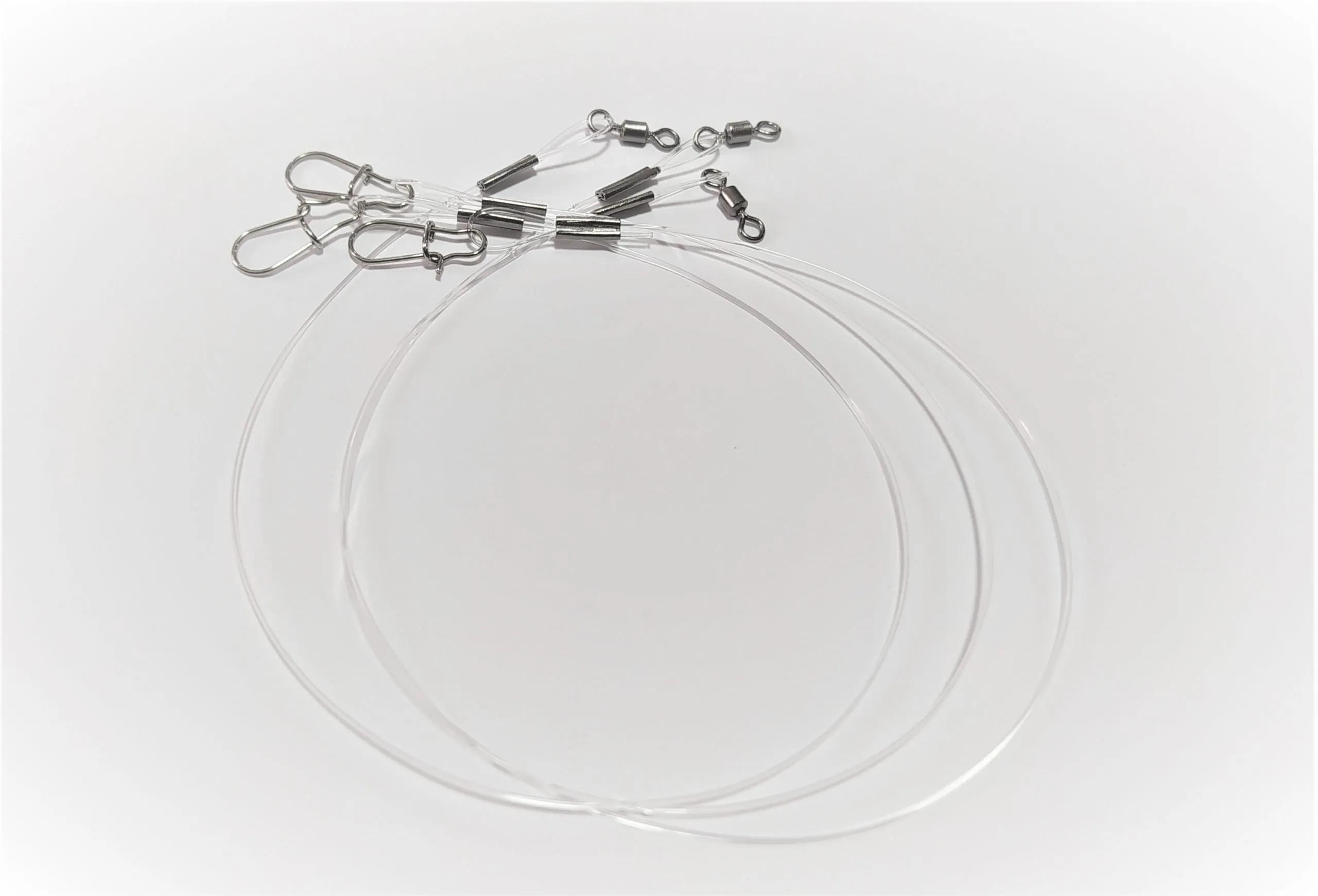 Bajos de línea de fluorocrbono de calidad con un quitavueltas en un extremo y grapa en el contrario. Además de facilitarte el cambio de señuelos y reducir los enredos, le aportará rigidez y le hace prácticamente invisible a los peces. Quidado de que el quitavueltas no se enganche en el puntero, provocando la rotura de la línea o la formación de una peluca. Comprueba con frecuencia su estado.