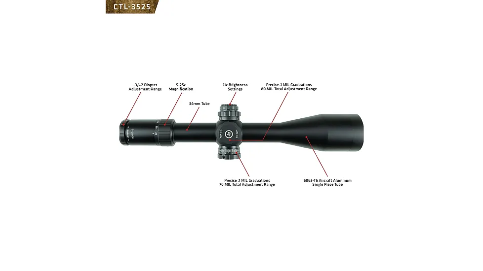 – Componentes incluidos: Este paquete integral cuenta con el alcance del rifle, batería, manual del sistema, manual de retícula y herramientas necesarias. Eleva tu experiencia táctica con la serie CTL-3525 3 y descubre un nuevo estándar en visores de rifle.