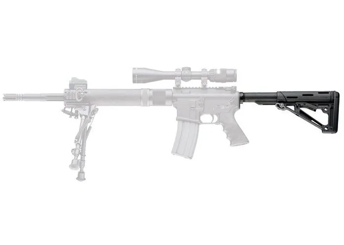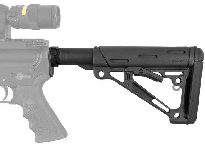 El tubo amortiguador de la culata Hogue AR15 OMC Mil-Spec tiene un tubo amortiguador de amortiguación de retroceso y la culata se puede fijar en cinco posiciones. La palanca de ajuste está protegida con un protector para evitar ajustes involuntarios. Además, hay tres puntos de fijación para una eslinga de pistola.