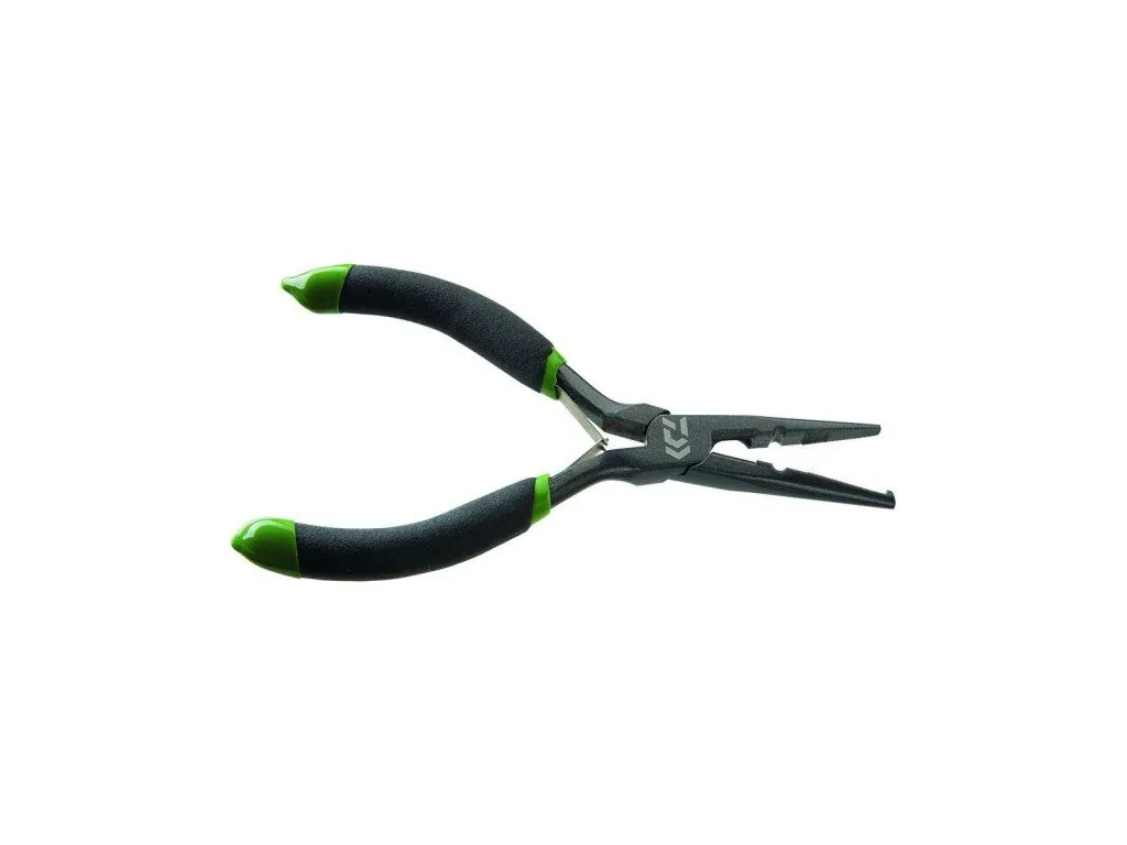 Un pequeño alicate plano de Daiwa anillos divididos especiales + cortadores de alambre. Mangos enfundados y antideslizantes para un mejor agarre y la máxima eficiencia. Estética «verde-negro».