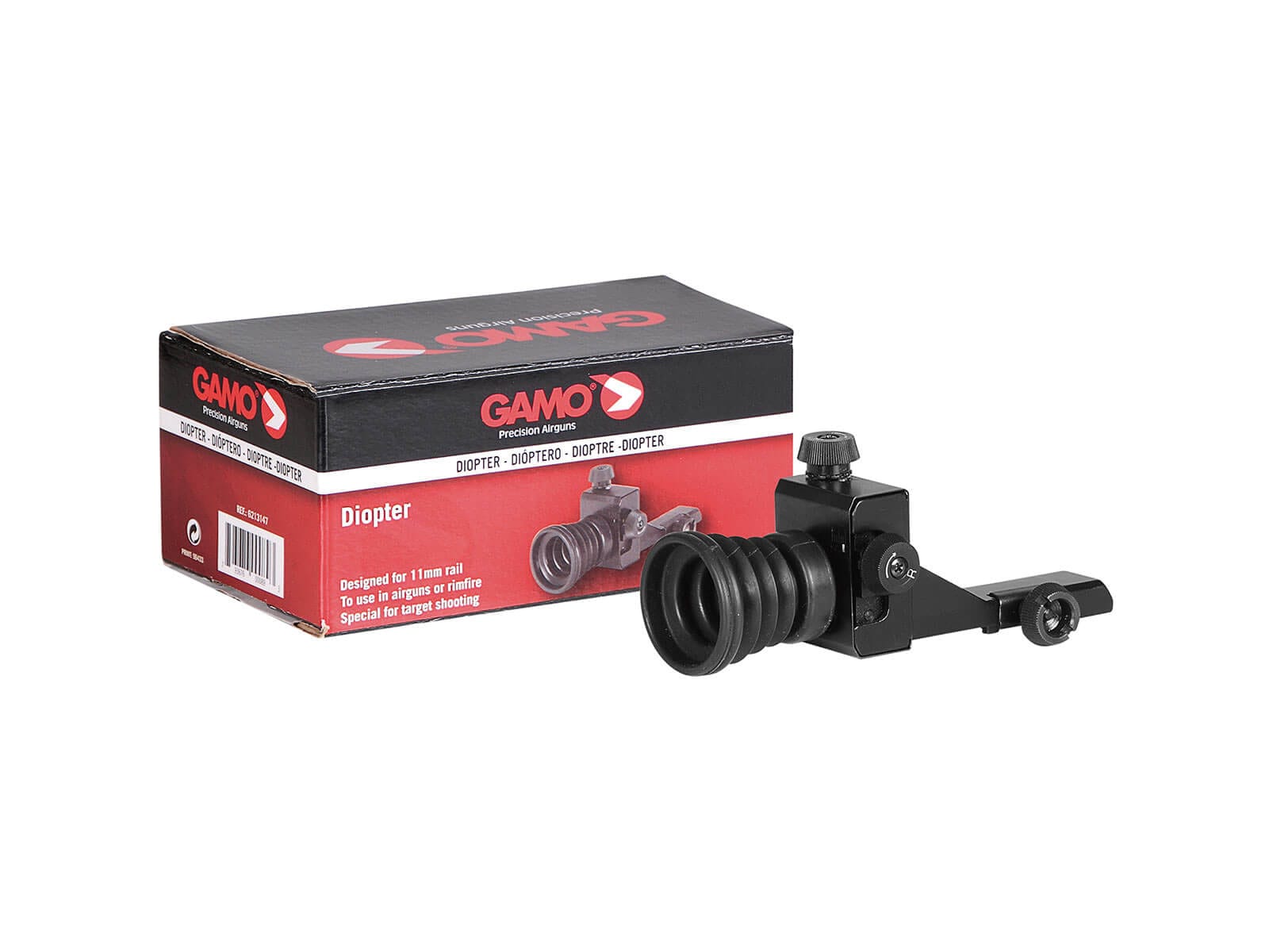 Gamo ha desarrollado esta mira de dioptría de precisión de grado de coincidencia para el creciente mercado de armas de aire comprimido. El Dióptero Gamo viene provisto para poder ajustar con click micrométrico y proporciona una imagen sin alteraciones y permanente en su carabina de aire comprimido. Diseñado para carril de cola de milano de 11 mm. Protección de goma para el ojo.