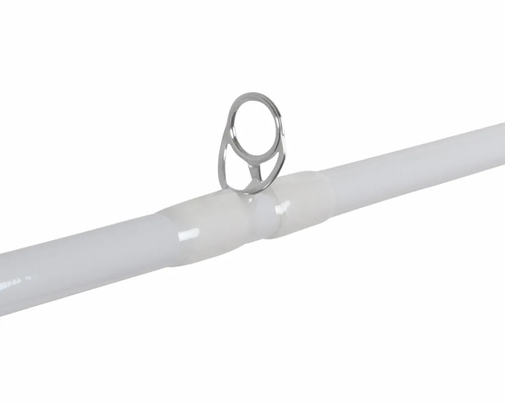 La caña tiene un marco de acero inoxidable 316 con construcción en blanco Sensi-Touch ™ para un peso ligero y durabilidad, y la pieza en bruto es Halo-Sanded ™ para fuerza y sensibilidad. La empuñadura EVA de alto impacto y resistente a los cortes ofrece sensibilidad y comodidad, y el asiento de carrete dividido ofrece una transmisión de vibración en blanco a mano.
