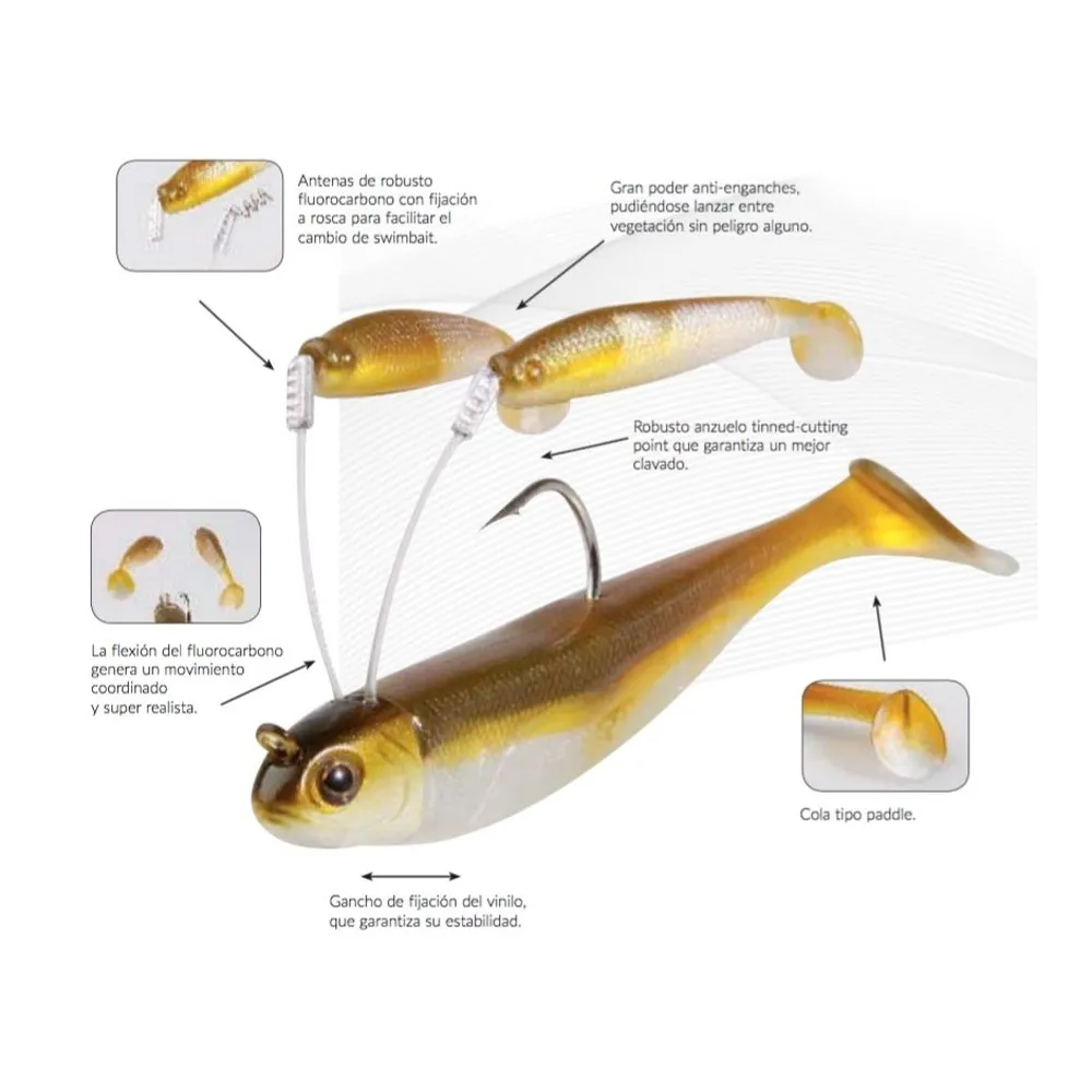 Este señuelo ya viene preparado para su utilización inmediata, sin necesidad de ningún montaje. Dotado de un swimbait principal armado de un potente anzuelo en acabado tinned y dos swimbaits.