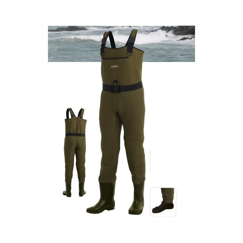 Vadeador de neopreno de 4.5 mm de espesor. Tirantes de neopreno regulables. Rodilleras preconformadas y bolsillo exterior en el pecho con cierre de velcro.