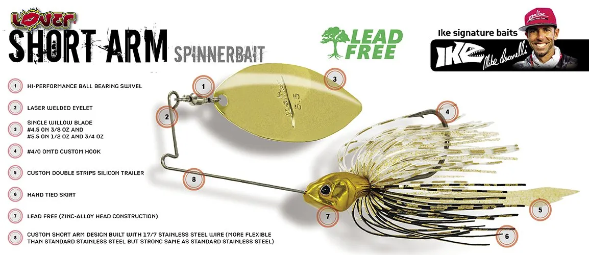 La nueva spinnerbait Molix Short Arm es un concepto verdaderamente innovador cuyas principales características radican en su original diseño, la estructura de la cabeza completamente libre de plomo en aleación Zinc-Alloy y en el alambre, realizado en acero inoxidable, más flexible, resistente y elástico que los estándar.