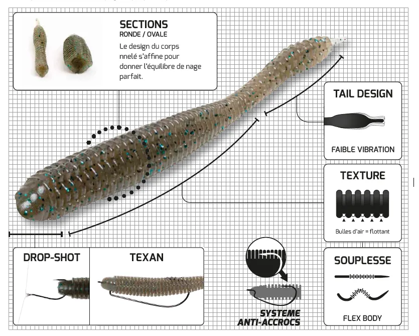 Es un vinilo FLOTANTE tipo gusano de estilo acanalado ideal para tirar en gotas. Es un gusano delicado que agrega un nuevo concepto raramente visto, la cola tiene una burbuja única que vibra y tiembla, esto hace que atraiga a los peces.