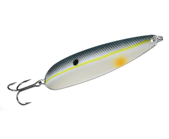 Cucharilla hecha para emular un pez cebo moribundo, el aleteo y la caída de esta cuchara es increíble.